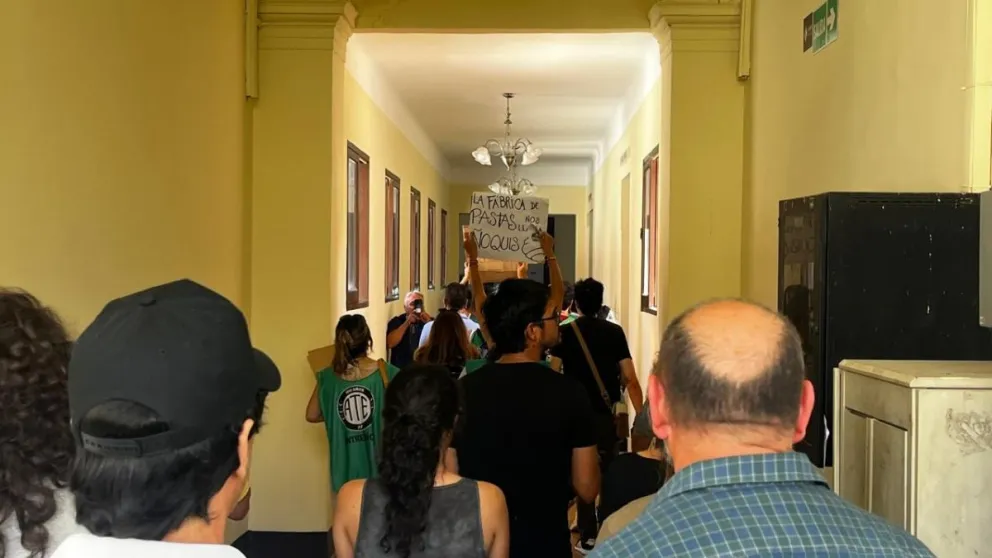 Tras la asamblea, los manifestantes recorrieron los pasillos de la Casa Gris colocando pegatinas con imágenes del gobernador Rogelio Frigerio y la leyenda «ajustador». Visitaron los despachos del secretario de Hacienda, Fabián Boleas, y del ministro de Gobierno, Manuel Troncoso.